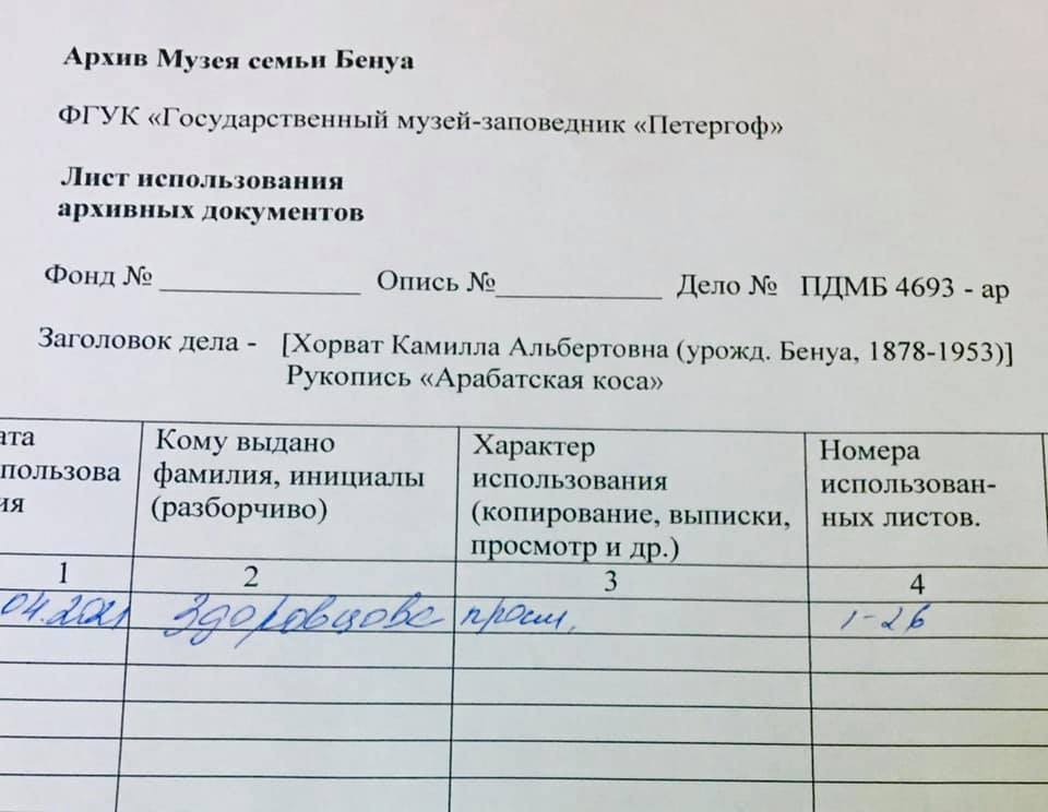 "В архиве ГМЗ «Петергоф» хранится рукопись-воспоминания Камиллы Альбертовны Хорват (урождённой Бенуа) «Арабатакая коса» о поездке на автомобиле из Санкт-Петербурга в Крым в 1911 г. В тексте описаны сложности путешествия по российским губерниям средней полосы и приключения туристов в Геническе и на Арабатской Стрелке. Для меня, лично, было неожиданным открытием то, что в начале 20 века, несмотря на все трудности, автомобиль фирмы «Бенц» смог преодолеть песчаные дороги и топи Арабатки."