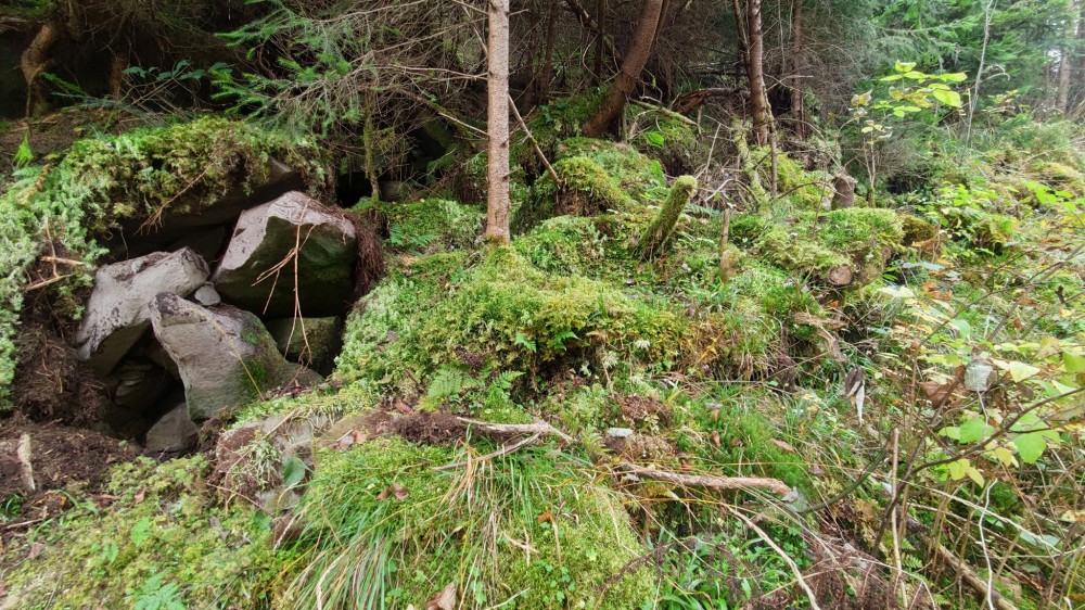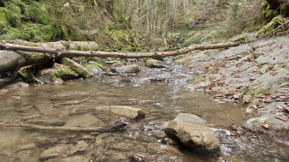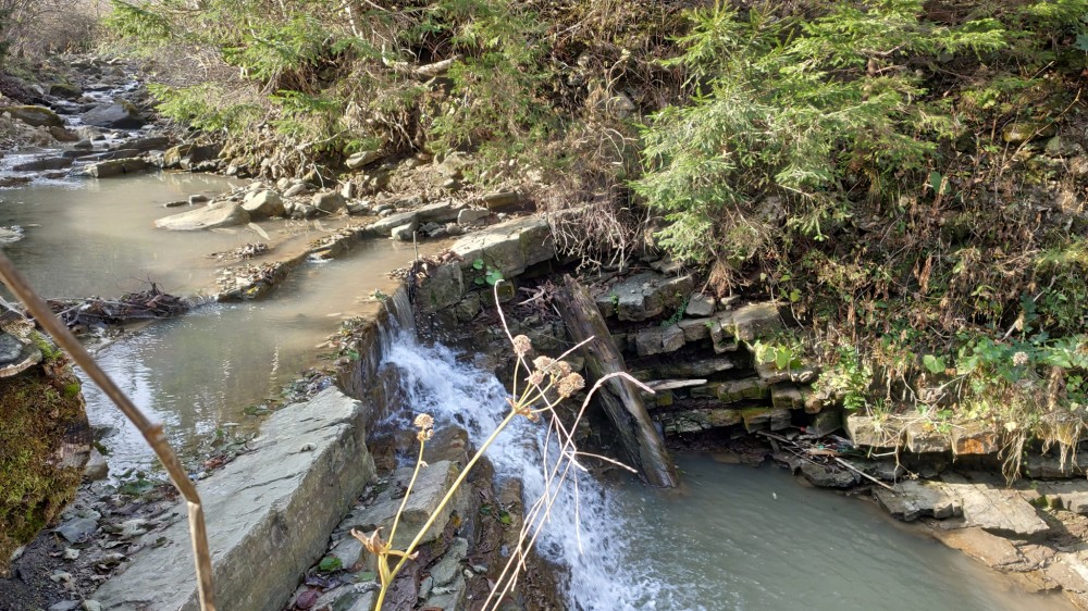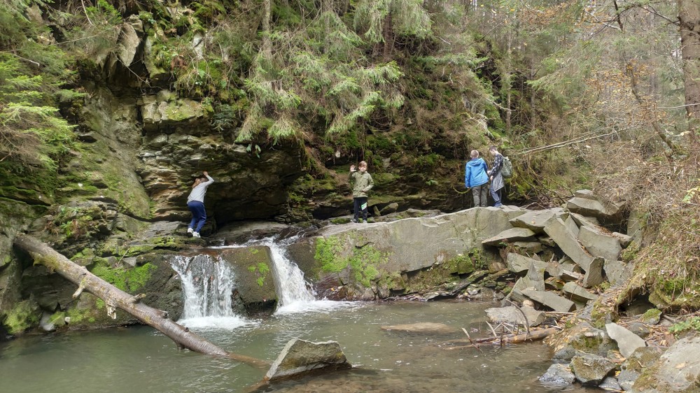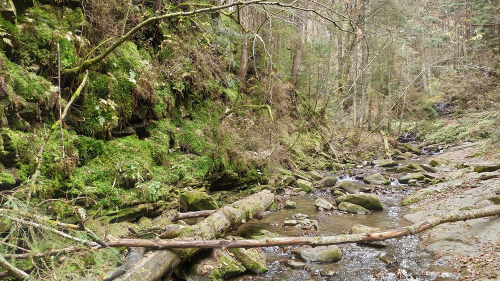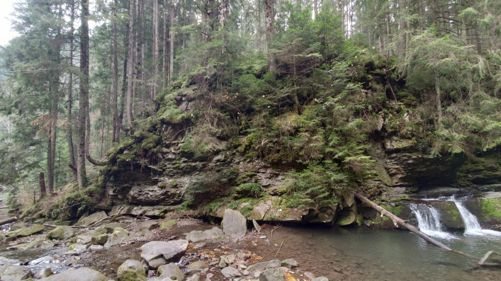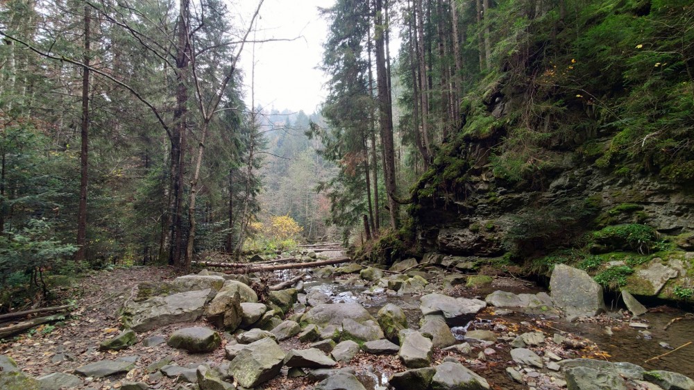 Дальше наш путь лежал к водопаду Дівочі Сльози. Пройдя ещё пару километров в гору, а потом немного вниз мы дошли до него. Красивое место. Заросли мха на отвесных скалах над водопадом выглядят, как будто из сказки. Сам водопад сейчас выглядит небольшим и маловодным. Я уже упоминал, что сейчас самая сухая осень в Карпатах за последние 60 лет.