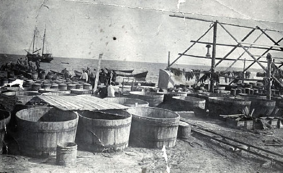 Несомненно, всё оставалось бы так и сейчас, если бы не бурный рост прибрежного человеческого населения, особенно, начиная с 1800 годов – большая империя получила доступ к переполненному рыбному «садку» - черпай и черпай, дна не видать! Среди российских и заграничных толтосумов образовался повышенный спрос на азовские рыбные деликатесы, особенно из реликтовых осетровых, и никого не смущали тысячекилометровые длительные транспортировки этих деликатесов без холодильных установок – азовские умельцы ловко обходились при их консервировании сивашской солью, азовским ветерком и, иногда, небольшим количеством опилок и веток для копчения. Происходило это на небольших «мобильных» рыбзаводиках (помните 26 кобозевских рыбзаводов? – именно таких, - ни стен, ни крыш!), подобных тому, что на фотографии, равномерно разбросанных по берегу моря, чтобы не везти скоропортящуюся рыбу далеко от мест промысла на тихоходных парусных баркасах.