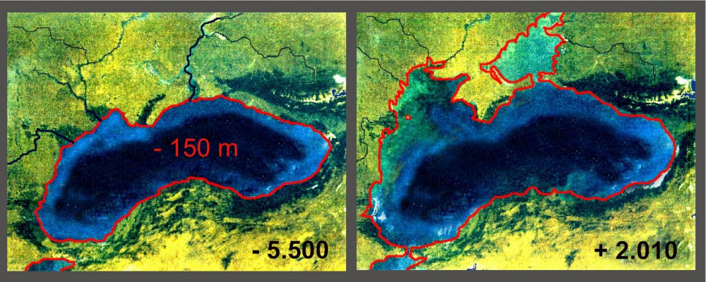 Впоследствии климат начал быстро теплеть, ледники начали обильно таять, уровень океана подниматься, приближаясь к современному, и около 7600 лет назад произошла природная катастрофа, называемая теперь Черноморским Потопом – из-за землетрясения и эрозии солёная вода Мраморного Моря прорвала перемычку на месте нынешнего пролива Босфор и хлынула гигантским стопятидесятиметровым водопадом в акваторию Чёрного моря, смешиваясь с пресной водой, и затапливая дно современного Азовского моря. За следующие 7500 лет здесь образовался настоящий рыбный рай с пресноводно-морскими рыбами – мелкое море, полное планктона, удобное для роста мальков с практически полным отсутствием крупных хищников.