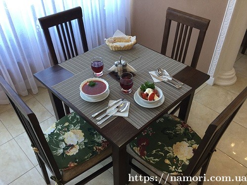 можно предварительно заказывать завтраки, обеды или ужины, (90 грн, 150 грн, 120 грн.), прием пищи осуществляется в обеденном зале или на беседке. Также приготовить еду можно самостоятельно на большой оборудованной всем необходимым кухне с выходом на большую террасу с камином.