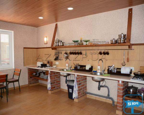 Для гостей оборудована общая кухня – современные мойки, газовые плиты, качественная импортная посуда, кастрюли и сковородки. Большая обеденная зона обустроена рядом с кухней, на веранде, укрытой от солнечных лучей и ветра. Продукты можно приобрести в близлежащих магазинах и на рынке.