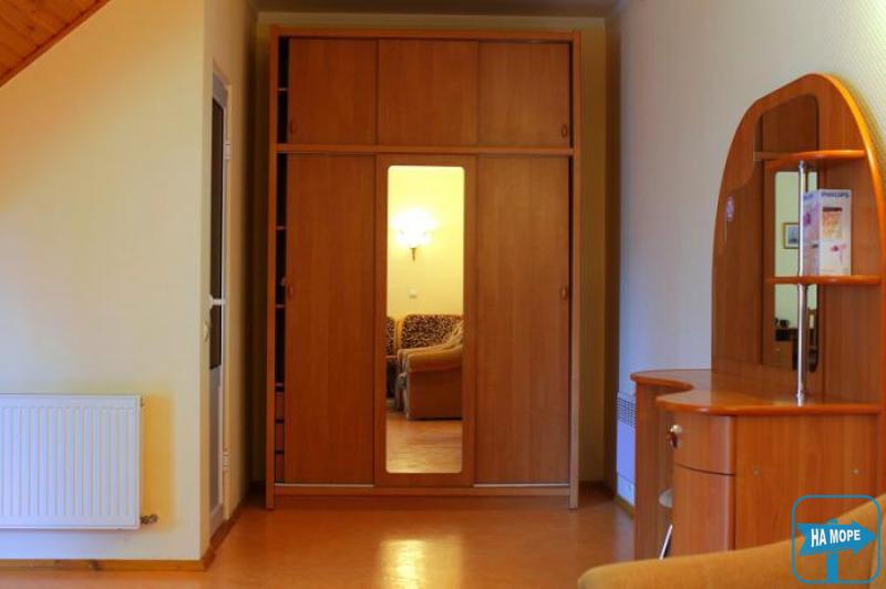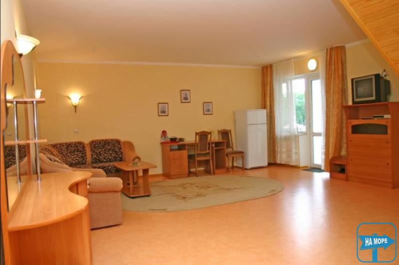 (номер люкс: 2-х ярусный, c кондиционером, спутниковымТВ, холодильником, мягкая мебель, туалет, умывальник, ванная (горячая и холодная вода круглосуточно), фен, чайник, необходимая посуда. В номере возможно размещение 5 - 6 человек.