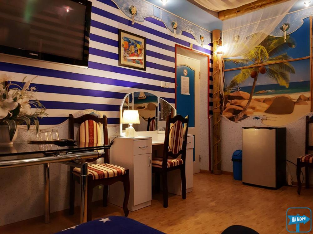 Тематический гостевой дом "Бриз" построен в пиратско-морском стиле. Находясь у нас в гостях, и в номерах, и на территории, вы ощущаете легкое прикосновение морского бриза в любой детали интерьера, и в каждой мелочи. Будь то летняя пощадка пиратского кафе, территория отеля, или номер. В 2017 году сделана полная реконструкция отеля, каждый номер оформлен в своем индивидуальном стиле: "Морской", "Шале", "Капитанский", "Сафари" и т.д. с авторским дизайнерским ремонтом.