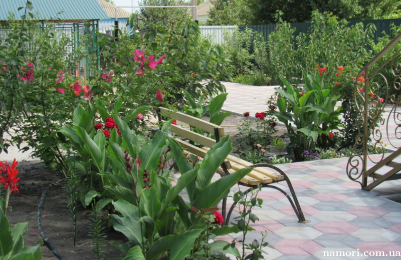 Ухоженный двор с фруктовыми деревьями и цветами.