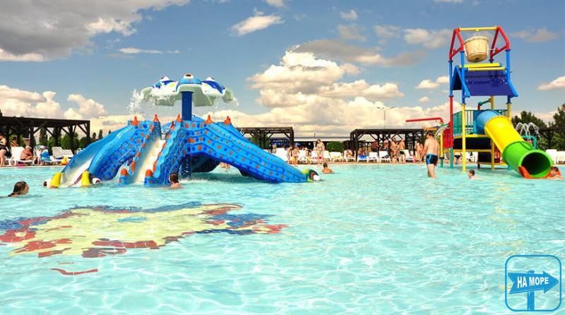 На территории гостиницы Аквапарк Коблево есть все условия для яркого летнего отдыха - просторные бассейны с водными горками и терраса для загара с шезлонгами. Возле этих развлечений работает бар с большим ассортиментом прохладительных напитков.