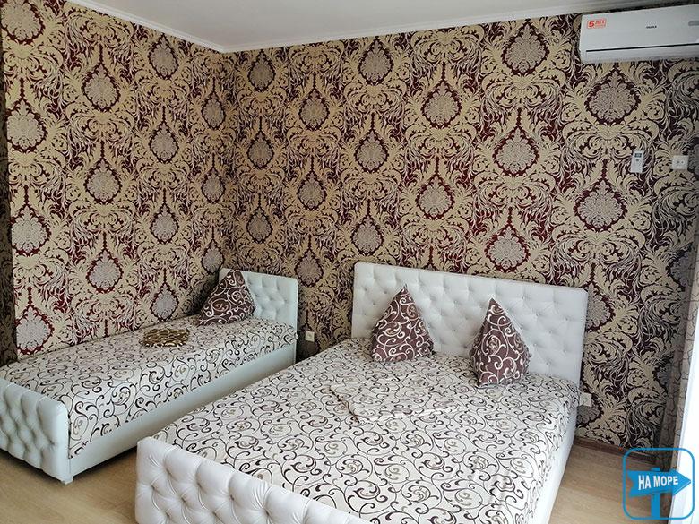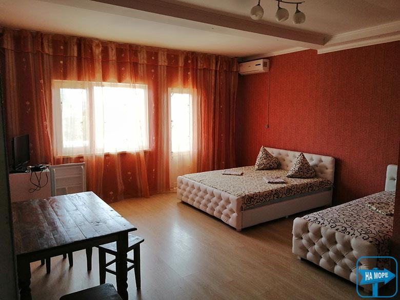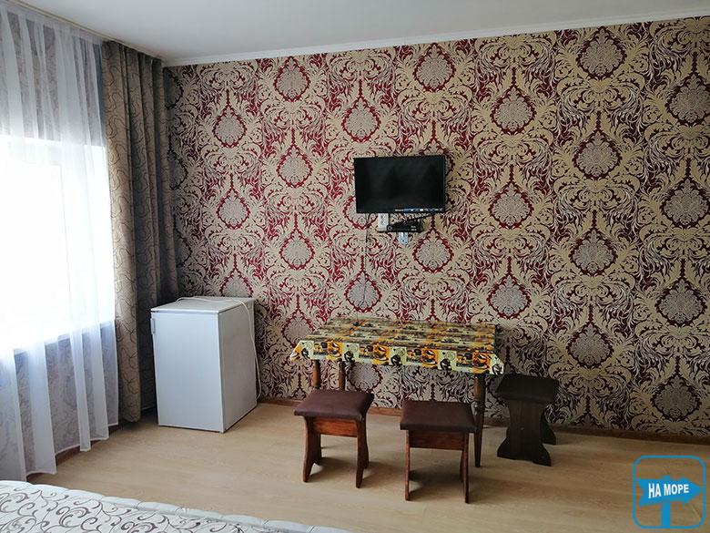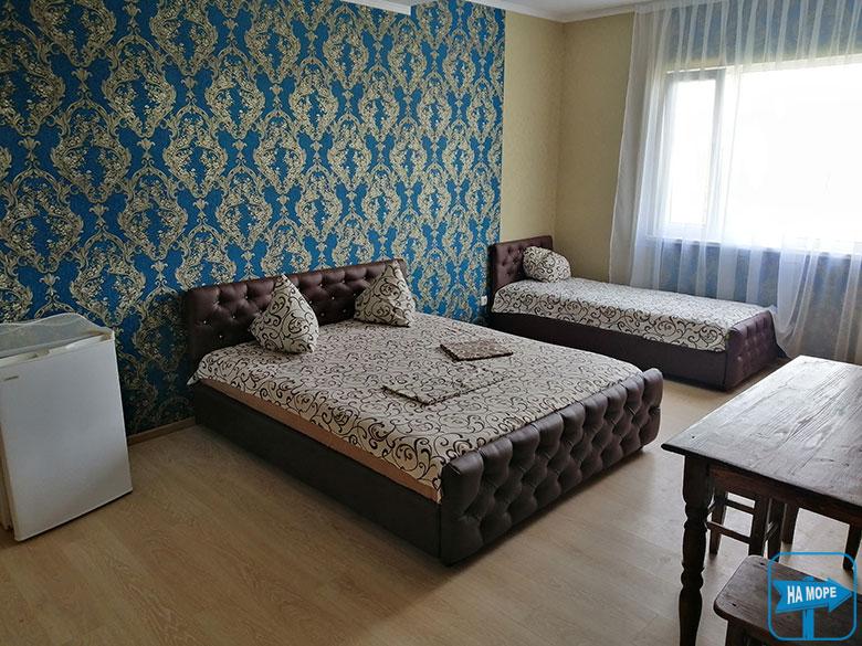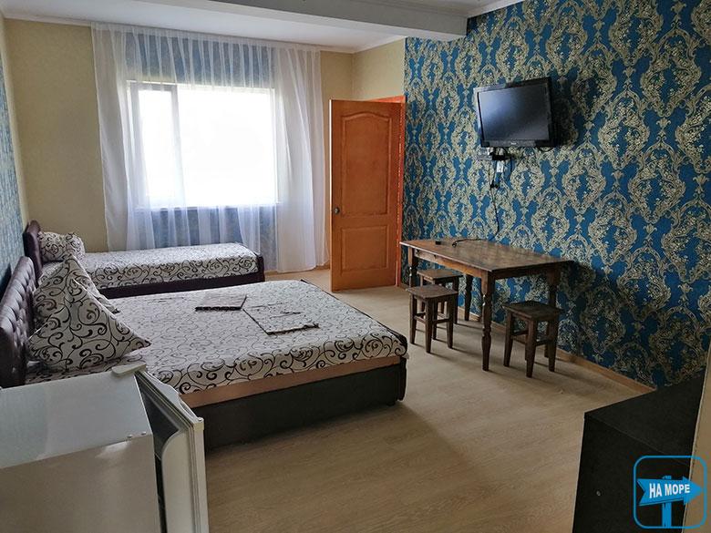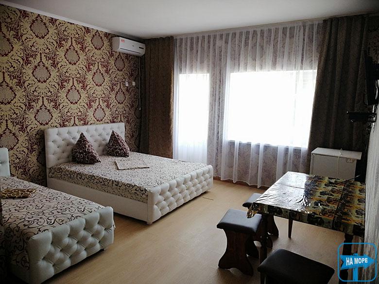 Номери укомплектовані всім необхідним для повноцінного відпочинку - нові сучасні меблі, двоспальні та роздільні ліжка з ортопедичними матрацами, холодильник, телевізор, кондиціонер, суміщений санвузол з цілодобовою подачею гарячої та холодної води. Є двокімнатні номери для проживання сім'ї до 5 осіб.