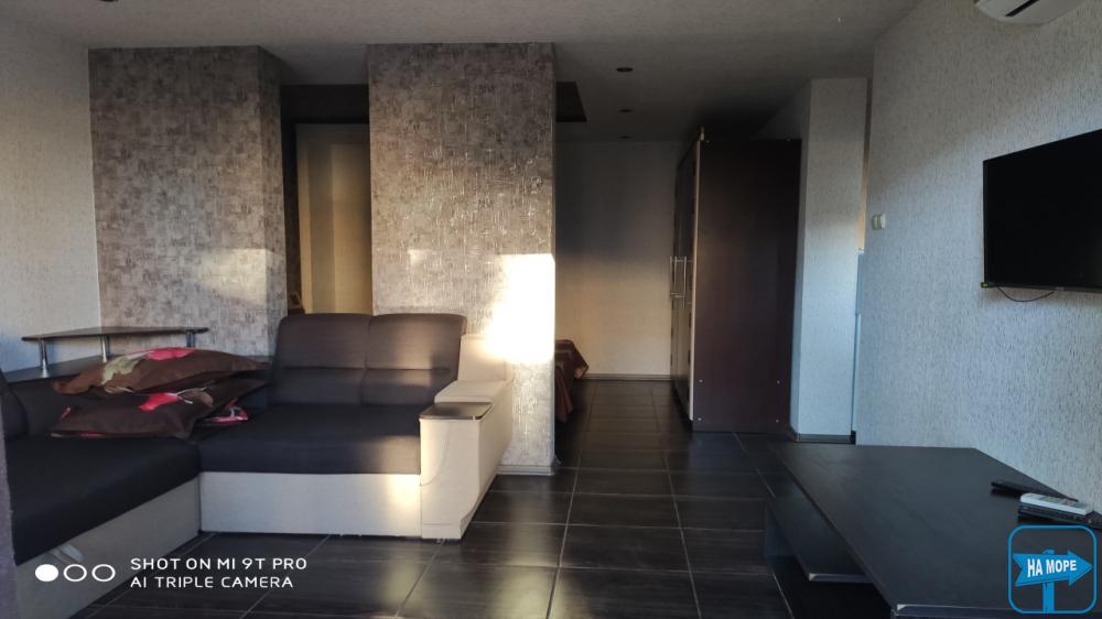 1 поверх: Вітальня з великим розсувним диваном, тв, кондиціонером і журнальним столиком, обідня зона, кухня, передпокій і балкон.