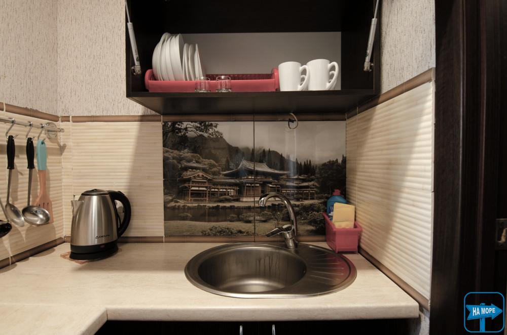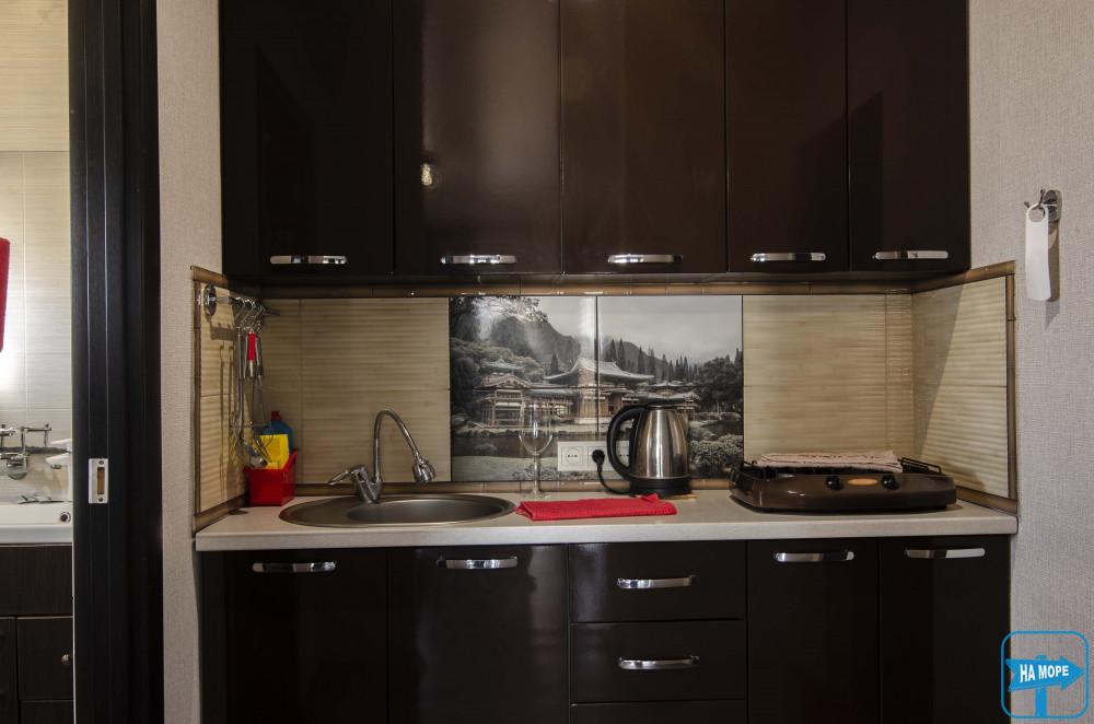 Номер має свою персональну кухню, обладнану всім необхідним інвентарем та посудом, аж до дрібниць, що важливо для сімей з дітьми.