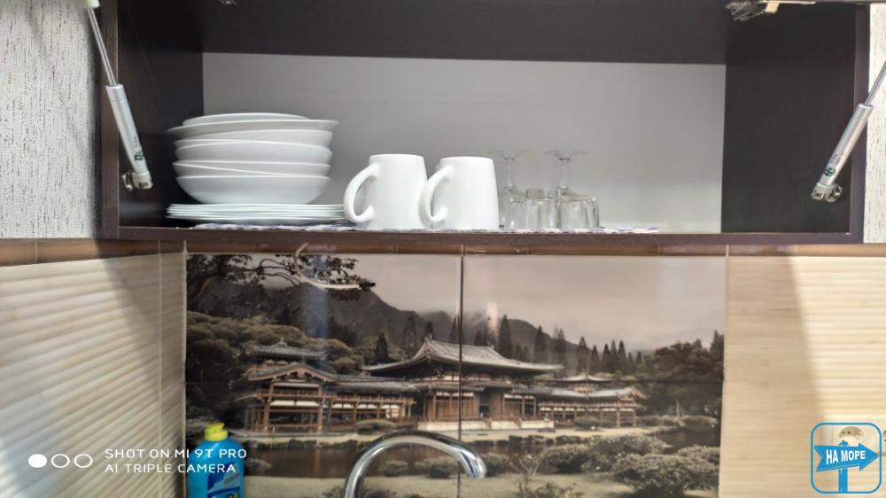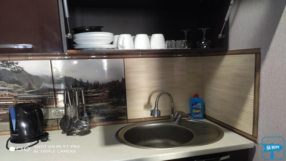 Номер має свою персональну кухню, обладнану всім необхідним інвентарем та посудом, аж до дрібниць, що важливо для сімей з дітьми. Просторий санвузол (4.0 кв.м.) з душовою кабінкою та шафкою для засобів особистої гігієни. Номер має власний балкон